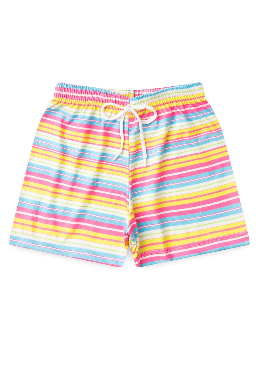 Shorts  em suplex sublimado colorido, possui elástico no cós e aplique de cordão.