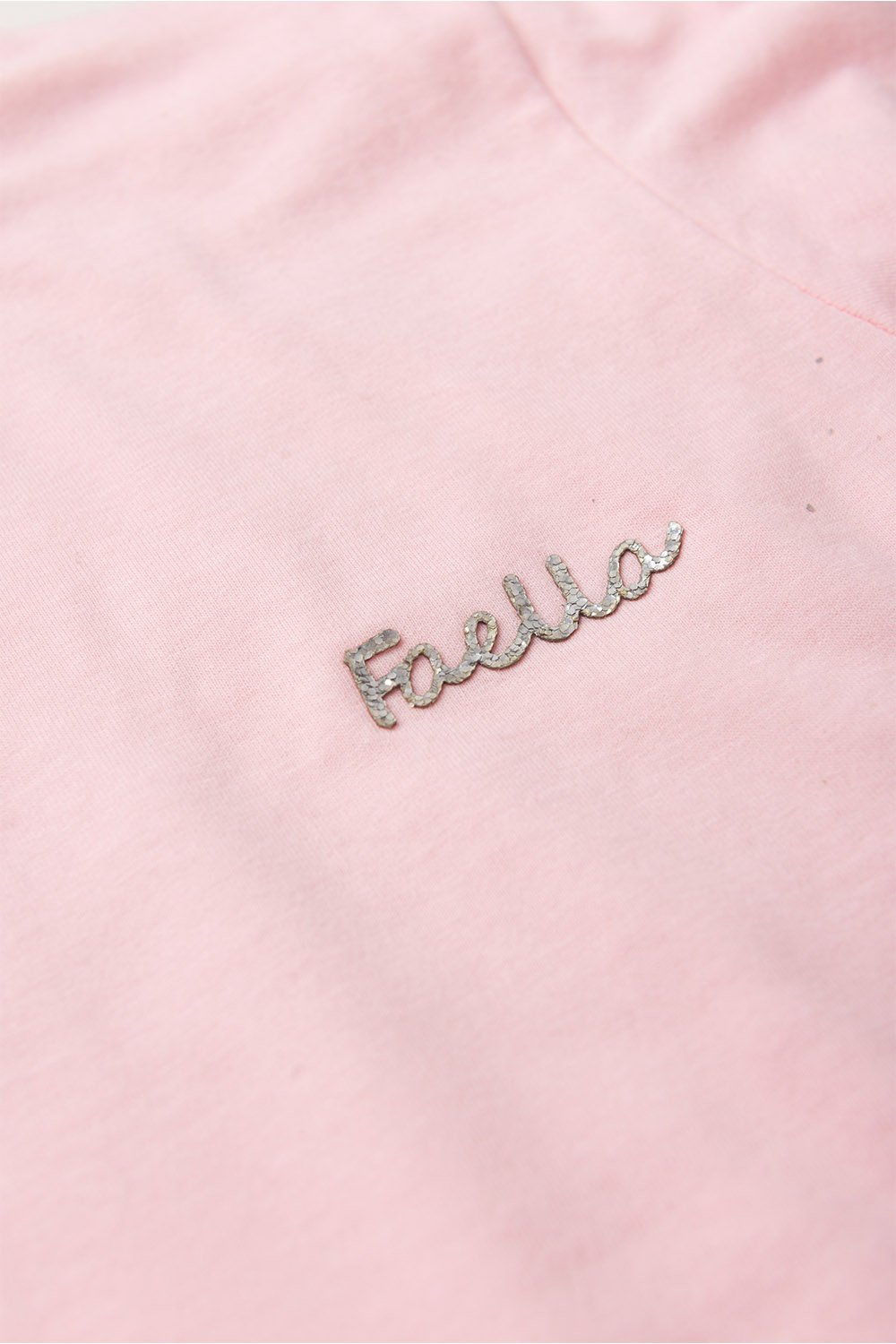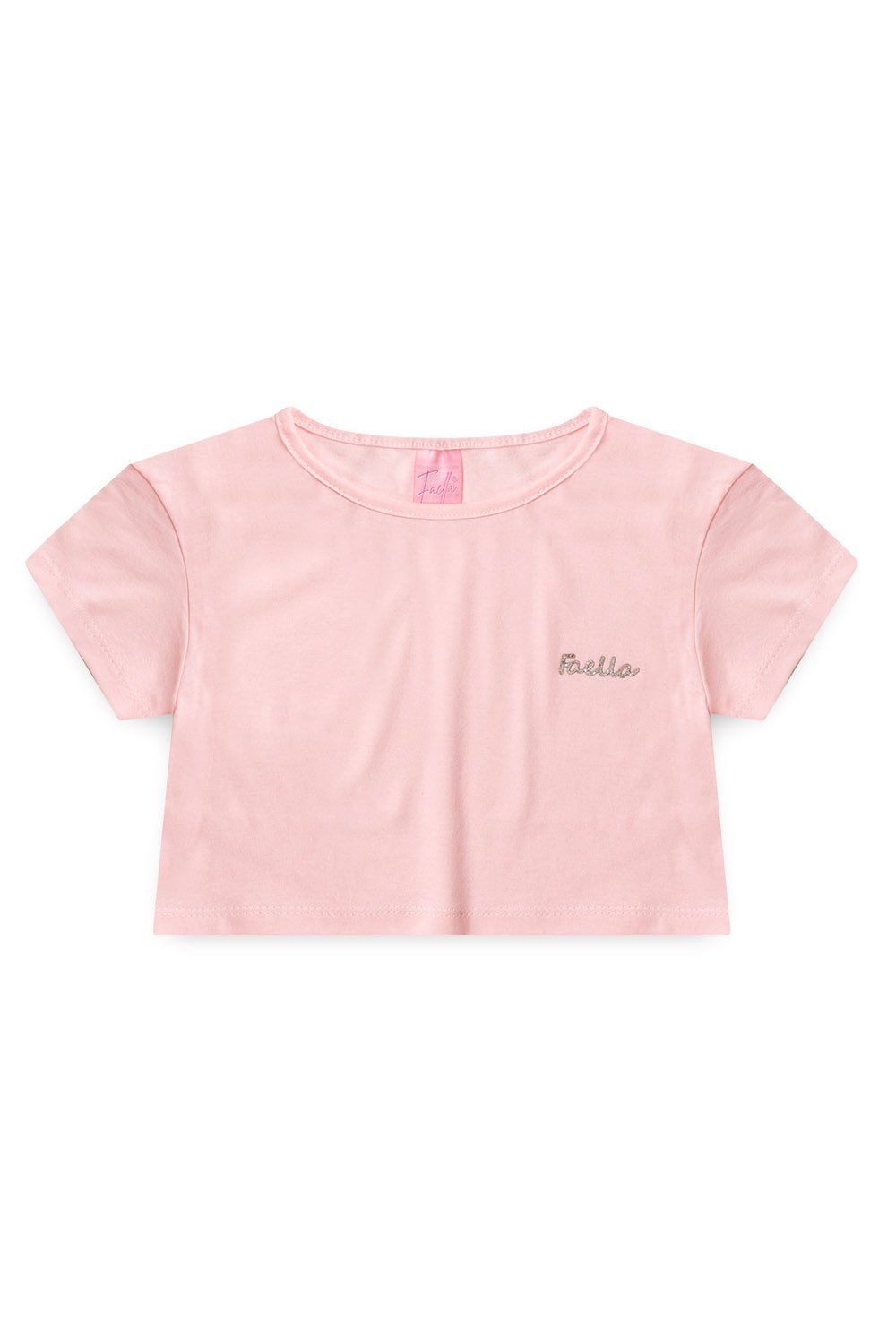 Cropped em Meia Malha na cor rosa com plaquinha faella, possui gola redonda, super estilosa.