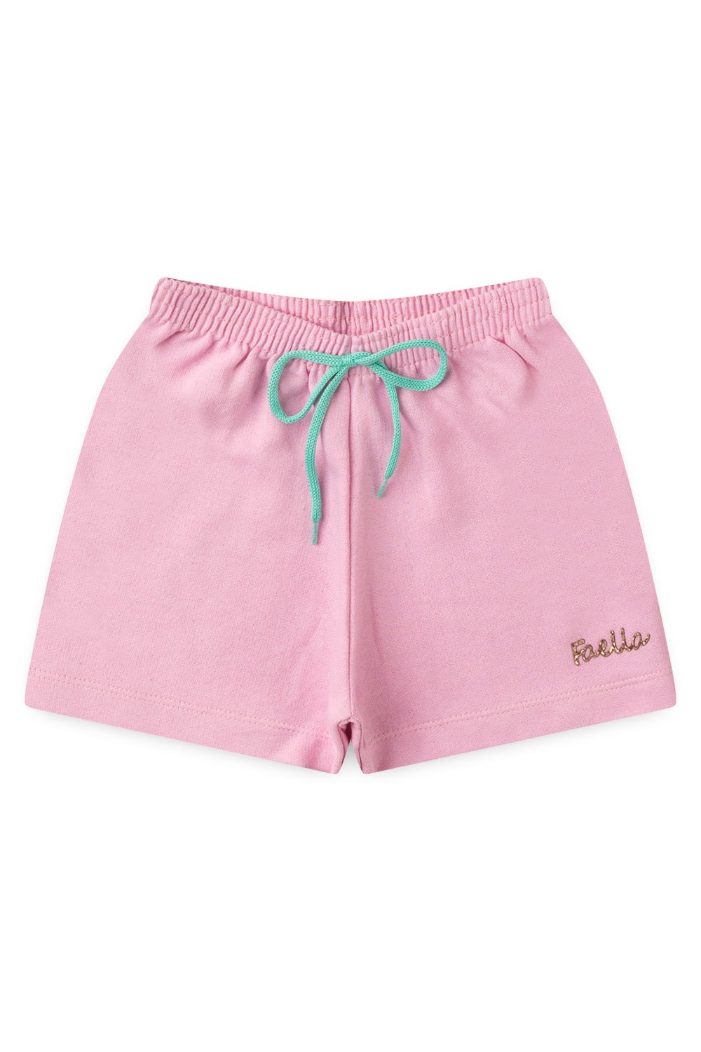 Shorts em moletinho na cor rosa, possui plaquinha Faella,elástico no cós e cordão decorativo.