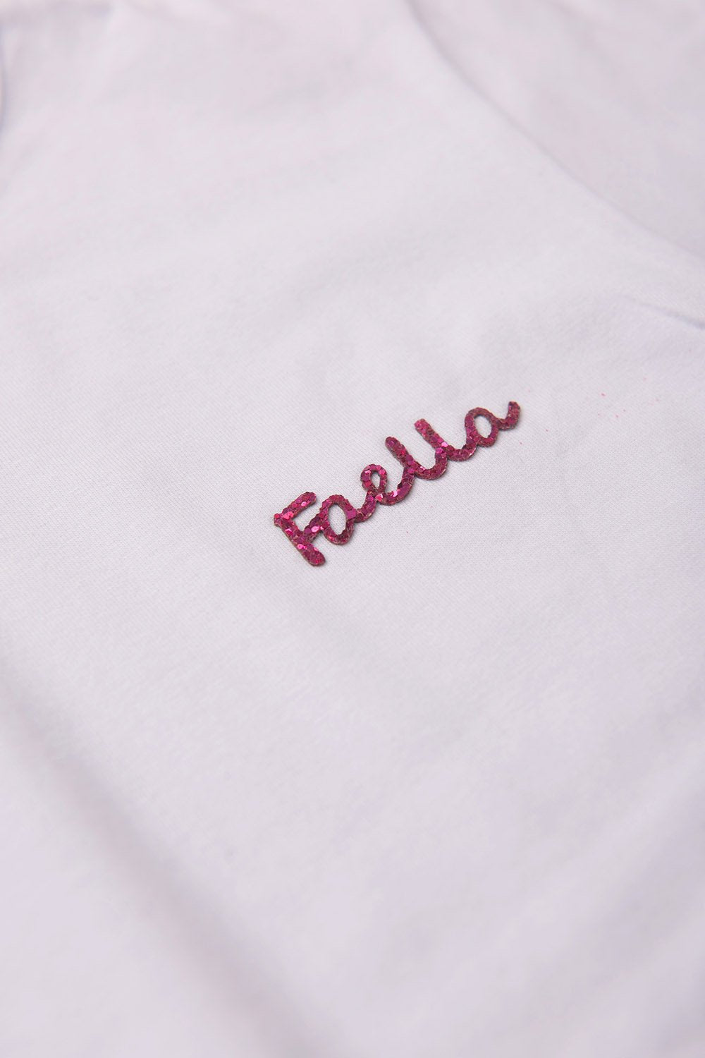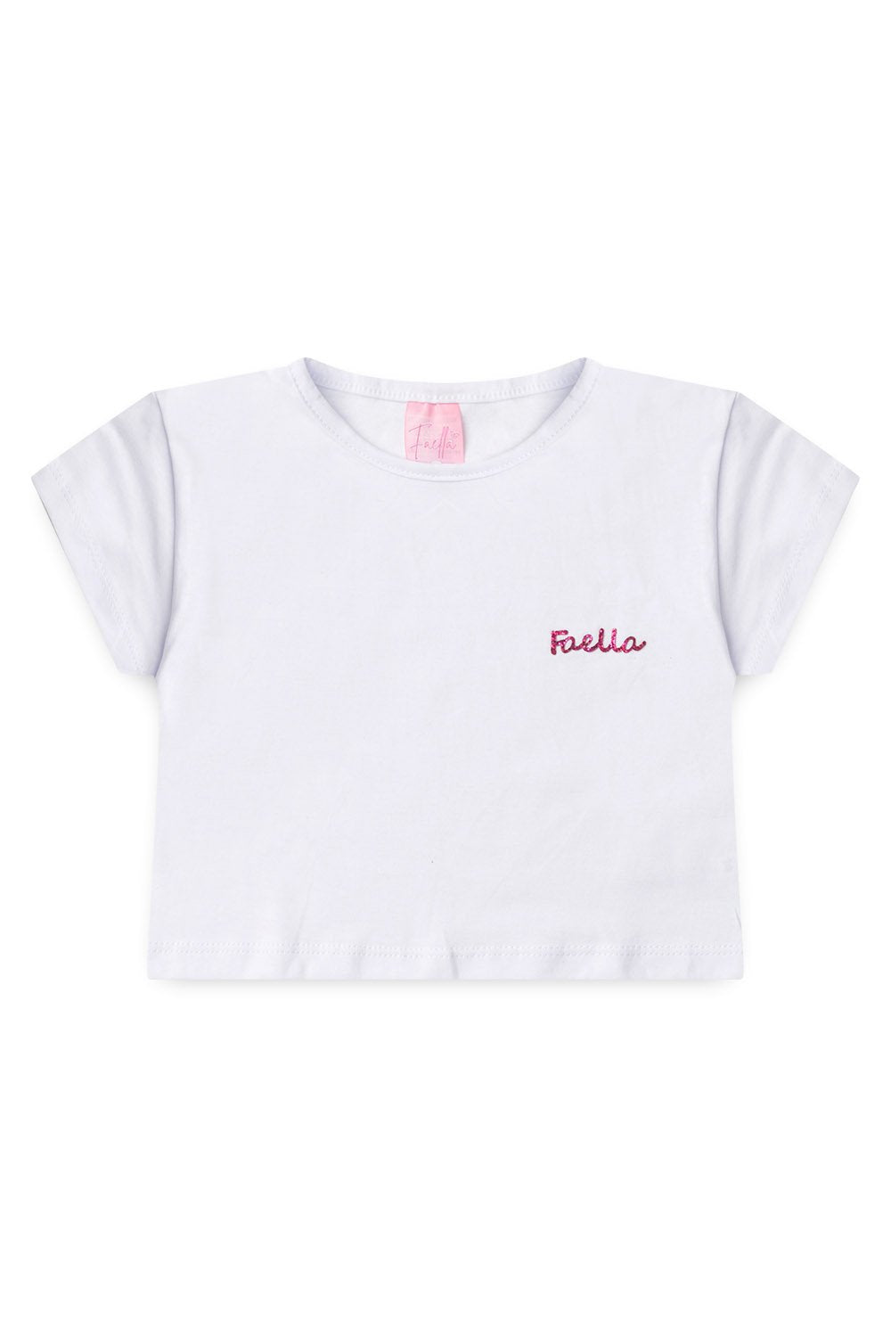 Cropped em Meia Malha na cor branca com plaquinha faella, possui gola redonda, super estilosa.