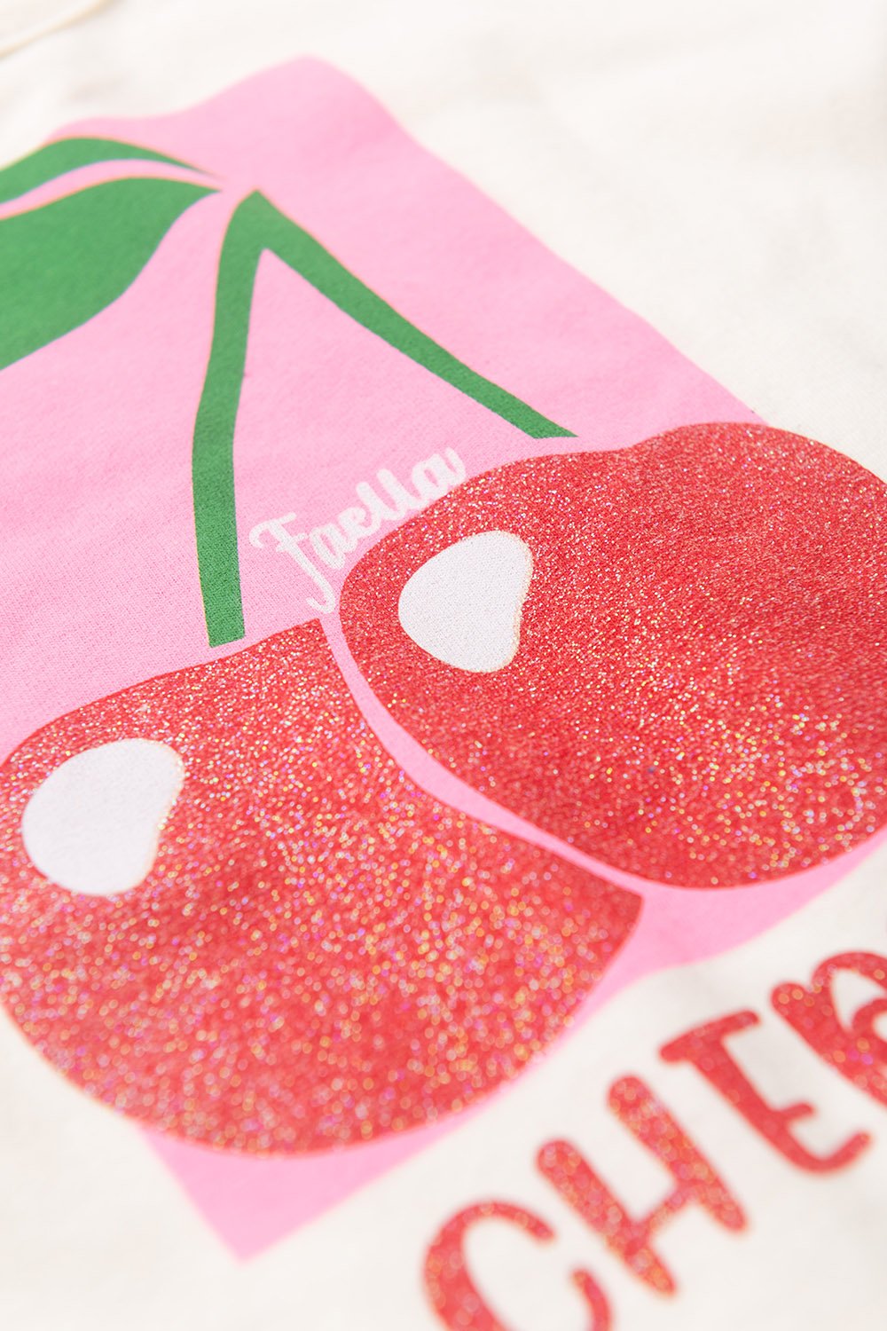 Cropped em Meia Malha na cor off white com estampa frontal de cerejas com brilho, gola redonda, super descolada e moderna.